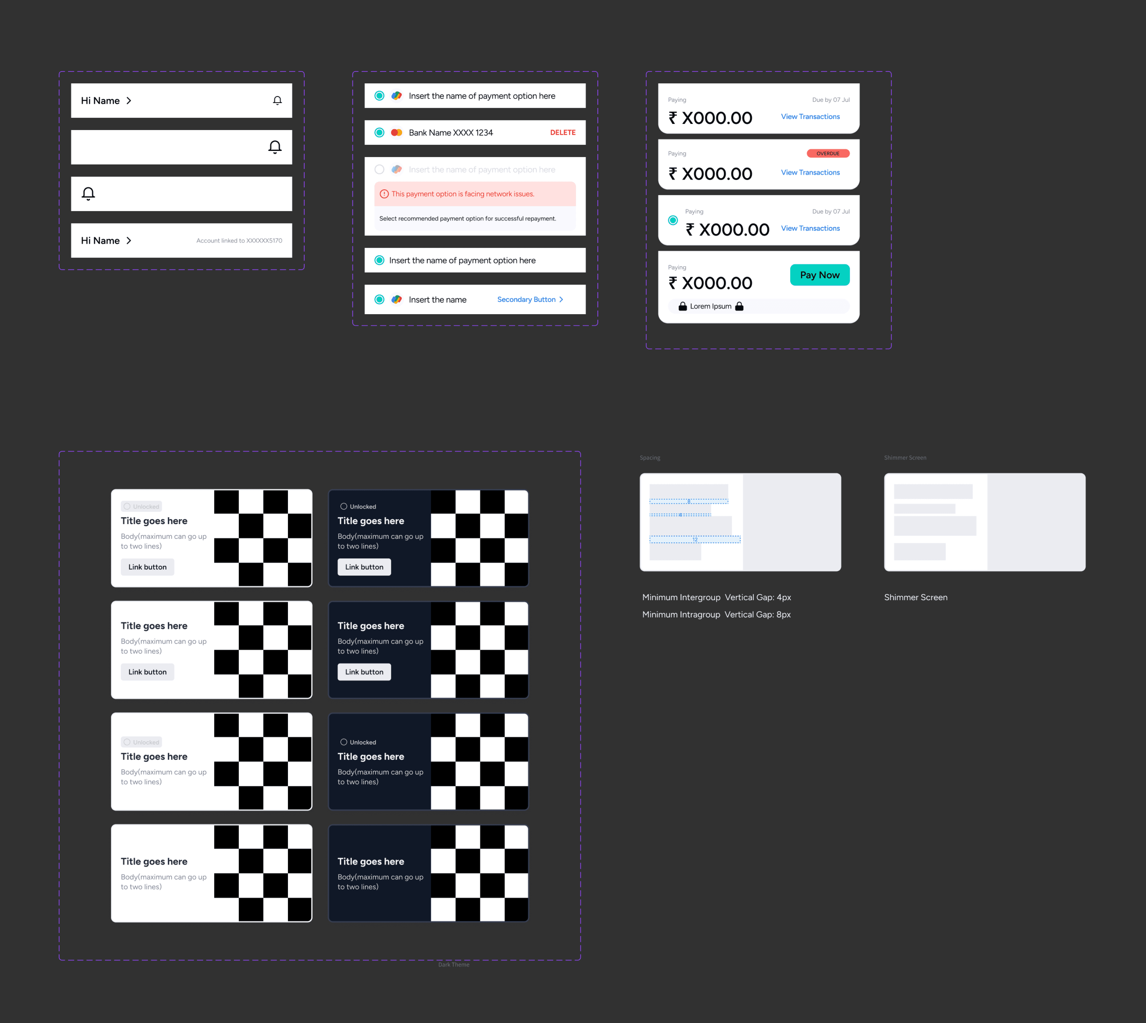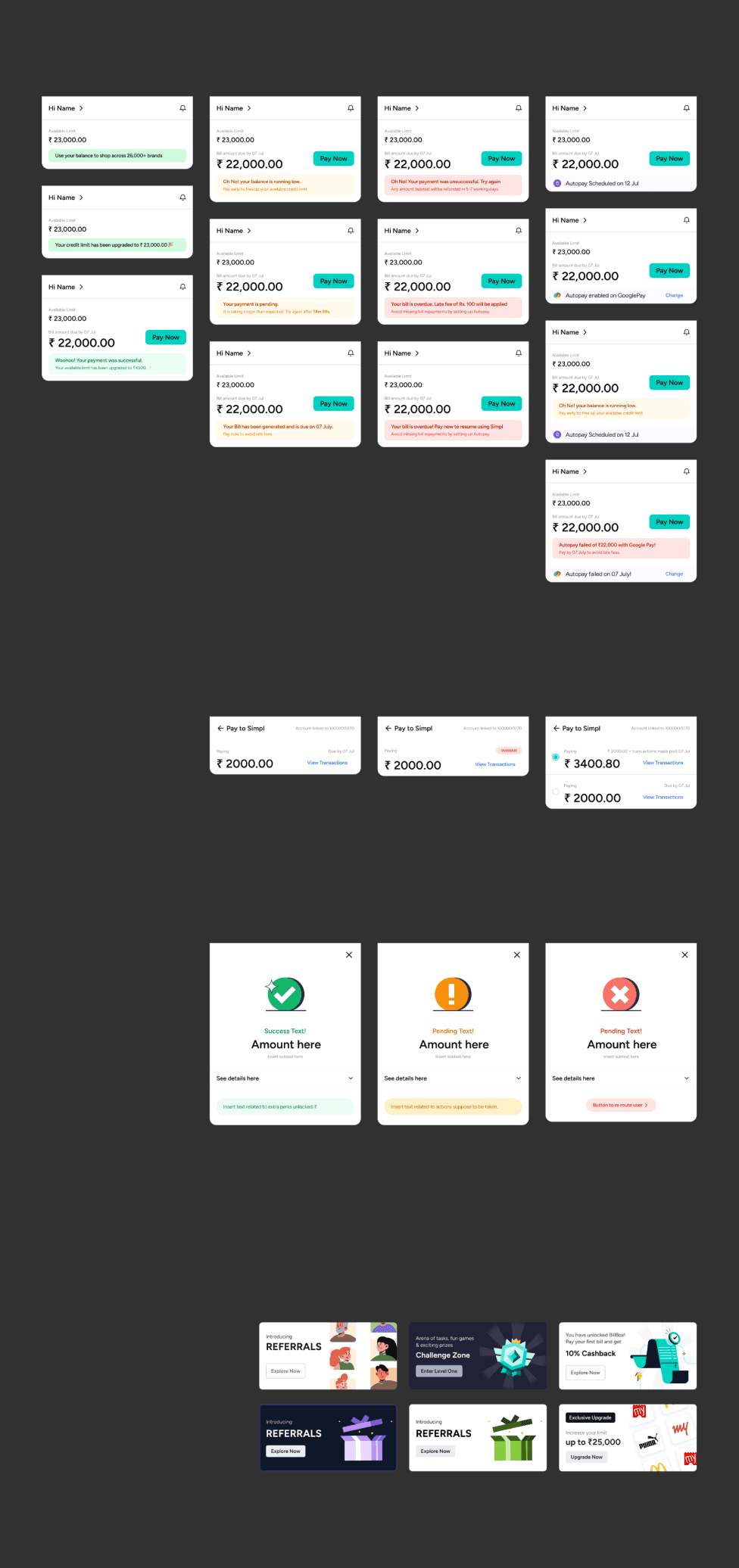 I created core Organisms by combining Atoms and Molecules to form complete, reusable interface sections: Navigation Header, Payment List Item, Card, and Recommended Section. These Organisms provided the large, systemic consistency necessary to build the main Homepage, the structured Repayment Page, and the final detailed Success Page with speed and reliability.